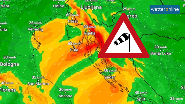 In der Nacht zum Donnerstag und am Donnerstagmorgen peitschen dann Böen bis 90 Kilometer pro Stunde die Hänge des Küstengebirges in Richtung Adria hinab. Im Tagesverlauf wird der Wind allmählich schwächer.